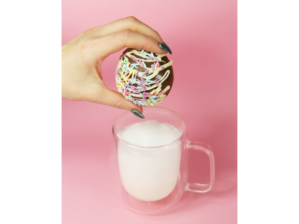 Zalij 150–200 ml horkého mléka, vlož čoko-bombu, nech ji rozpustit a jemně promíchej.