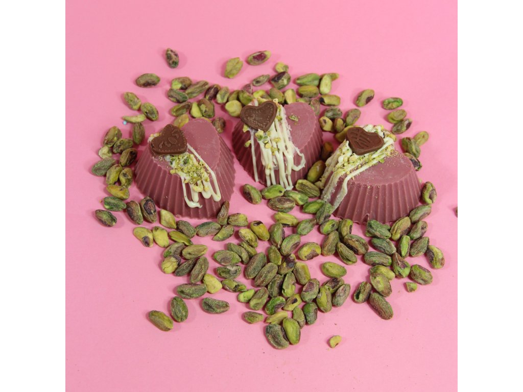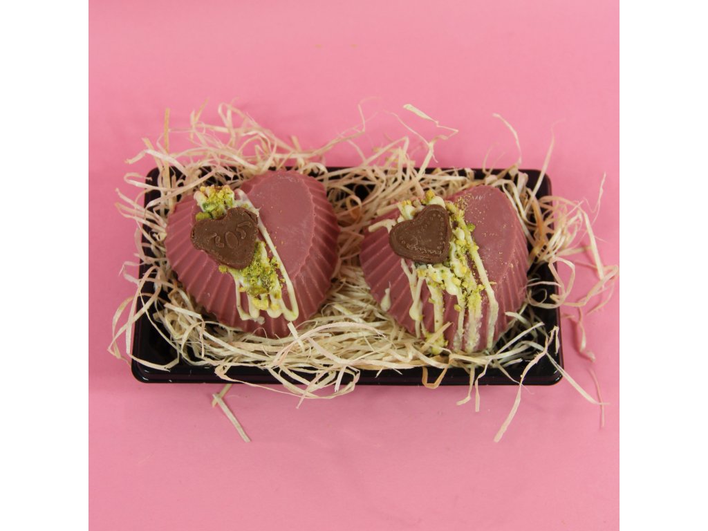 Vláčné brownie ve tvaru srdce, zalité rubyčokoládou a plněné pistáciovou pastou s kousky pistácií.  To vše vytváří dokonalou souhru chutí, kterou rozhodně okouzlíš tvého partnera.