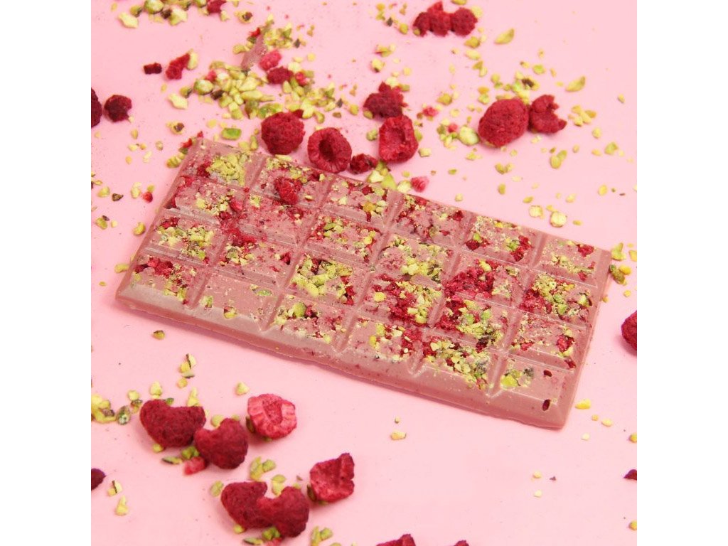 Luxusní ruby čokoláda s jemně kyselkavými malinami a křupavými drcenými pistáciemi. Přirozeně růžová, dokonale vyvážená ovocná chuť, která okouzlí na první kousnutí